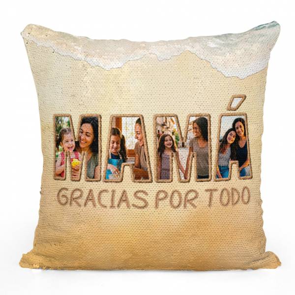 No olvides guardar tu personalización para poder añadirla al carritoUn regalo lleno de emoción y sorpresa para celebrar el Día de la Madre. Este original cojín de lentejuelas doradas esconde un diseño muy especial: las letras “MAMA” rellenas con vuestras fotos, que aparecen al pasar la mano y voltear las lentejuelas, revelando poco a poco un recuerdo único y lleno de cariño.